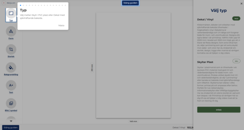 Skapa PVC-skyltar och vinyldekaler direkt i vår Printshop - snabbt, enkelt och helt anpassningsbart. Bygg din design från grunden med val för typ, form, storlek, färg och text, eller utgå från en färdig mall.