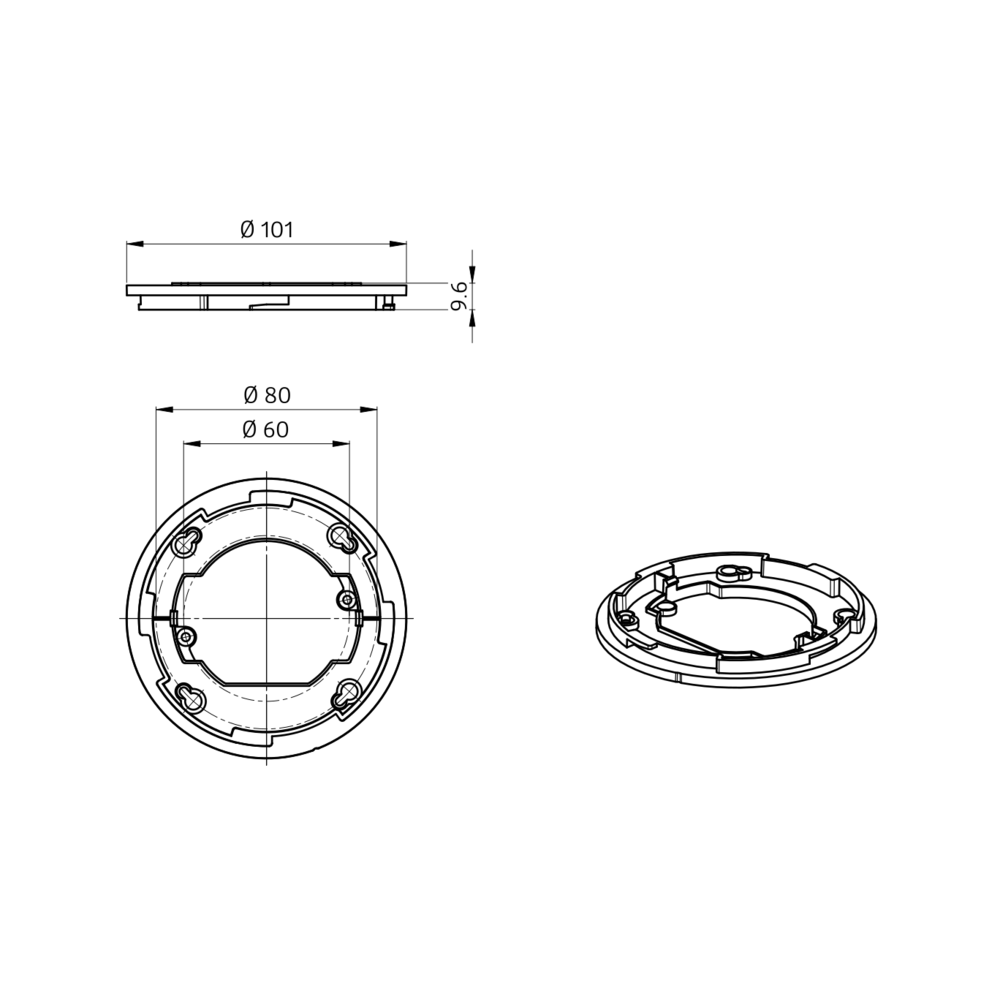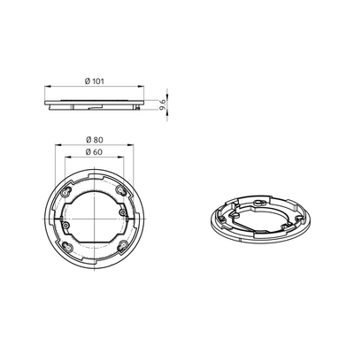 Adapterring för montering av PD2N TAK, undertaksenheter i infälld installation eller i kombination med utanpåliggande förhöjningsramar eller väggfäste. Kompletteras med tillbehöret täckring PD2N UTP i valfri färg.