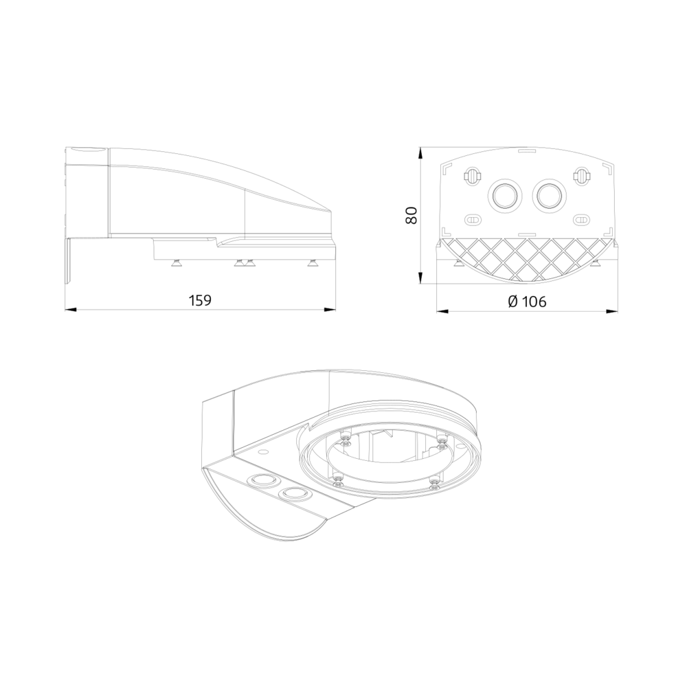 Levereras inkl. skruv. Väggmonteras med matning bakifrån, underifrån eller ovanifrån. Går även att montera på apparatdosa.