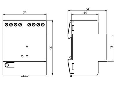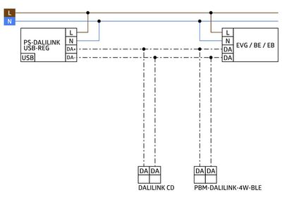 - Upp till 45 DALI armaturer och 10 styrenheter DALI LINK (Sensorer, tryckknappsgränssnitt och relä) kan anslutas till strömförsörjningen.